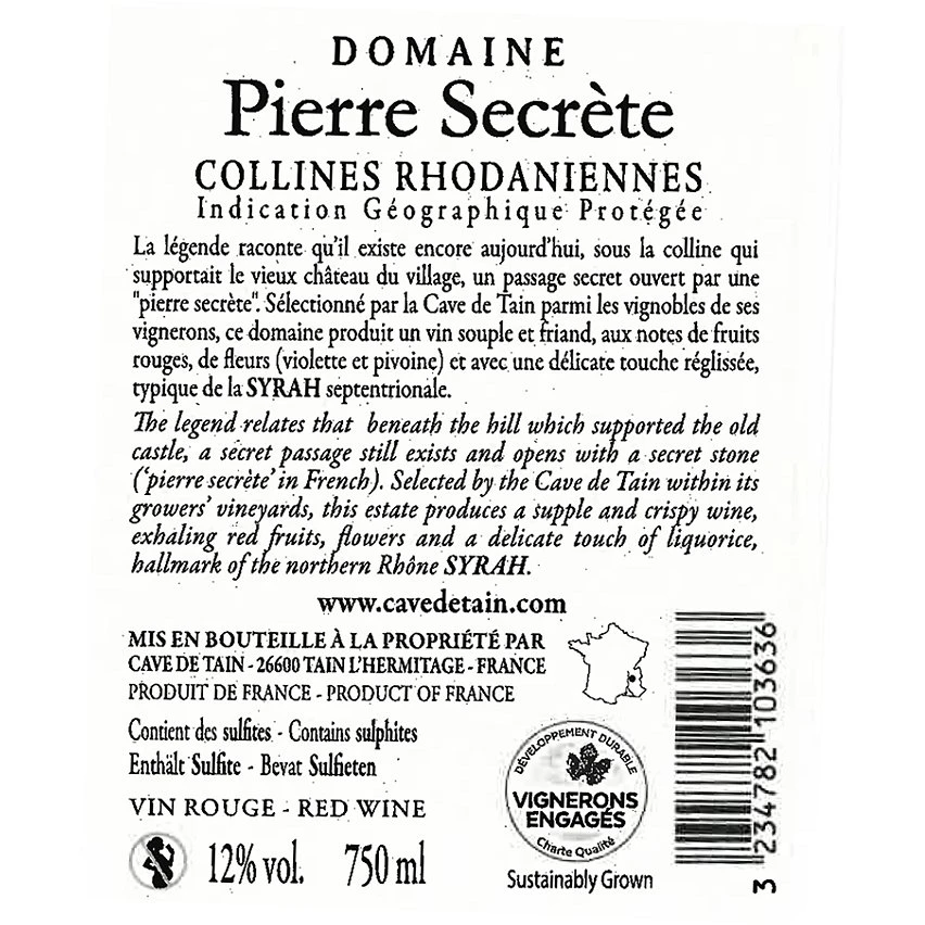 La légende raconte qu’il existe encore aujourd’hui, sous la colline qui supportait le vieux château du village, un passage ouvert par une « pierre secrète ».Sélectionné par la Cave de Tain parmi les vignobles de ses vignerons, ce domaine produit un vin rouge ample et bien structuré avec des arômes de mûre, de cassis, de réglisse et d’épices, typiques de la Syrah septentrionale.