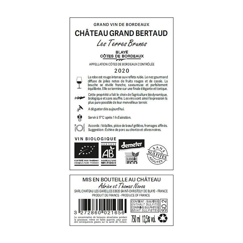 Acheter 🥰 Château Grand Bertaud Les Terres Brunes BIO, 2020 – Blaye Côtes de Bordeaux AOP – Rouge – 75 cl 🎉