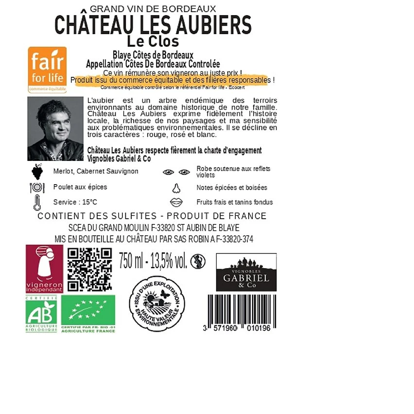 | Conseils du sommelier | Un bordeaux charmant, bio et abordable, mais avant tout très bon dans un profile pur, souple et moderne. Cet assemblage dominé par le Merlot associé à un peu de Cabernet Sauvignon nous offre un nez au fruit croquant avec des notes de cassis, de baies rouges et d’herbes aromatiques. L’attaque en bouche est vive et pleine de fraicheur, suivie d’un fruité dense et savoureux soutenu par une légère touche de bois qui m’évoque la délicieuse idée d’un accord avec un rôti de veau aux champignons. |
