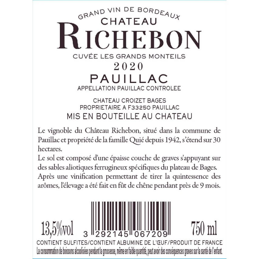 Le vignoble du Château Richebon, situé dans la commune de Pauillac et propriété de la famille Quié depuis 1942, s’étend sur 30 hectares. Le sol est composé d’une épaisse couche de graves s’appuyant sur des sables aliotiques ferrugineux spécifiques du plateau de Bages. Après une vinification permettant de tirer la quintessence des arômes, l’élevage a été fait en fût de chêne pendant prêt de 12 mois.