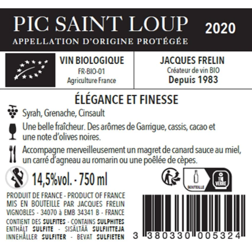 Promo 🧨 Jacques Frelin BIO, 2020 – Pic-Saint-Loup AOP – Rouge – 75 cl 😀