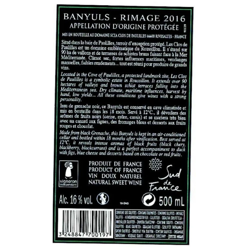 Promo 😀 Les Clos de Paulilles Rimage, 2016 – Banyuls AOP – Rouge – 50 cl 🌟