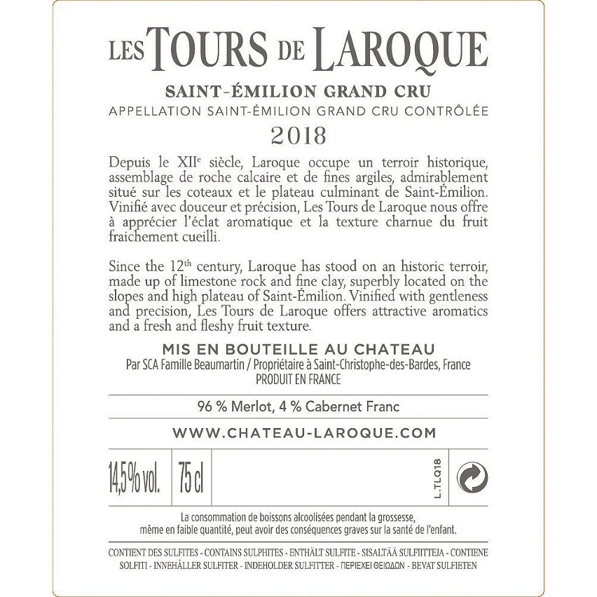Vente flash đ Les Tours de Laroque, 2018 – Saint-Emilion Grand Cru A.O.P. – Rouge – 75 cl â