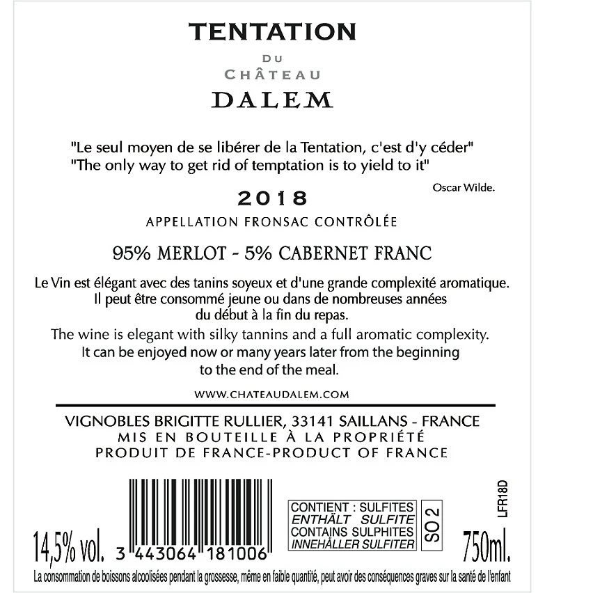 Sortie ✔️ Tentation du château Dalem, 2018 – Fronsac AOP – Rouge – 75 cl 🎁